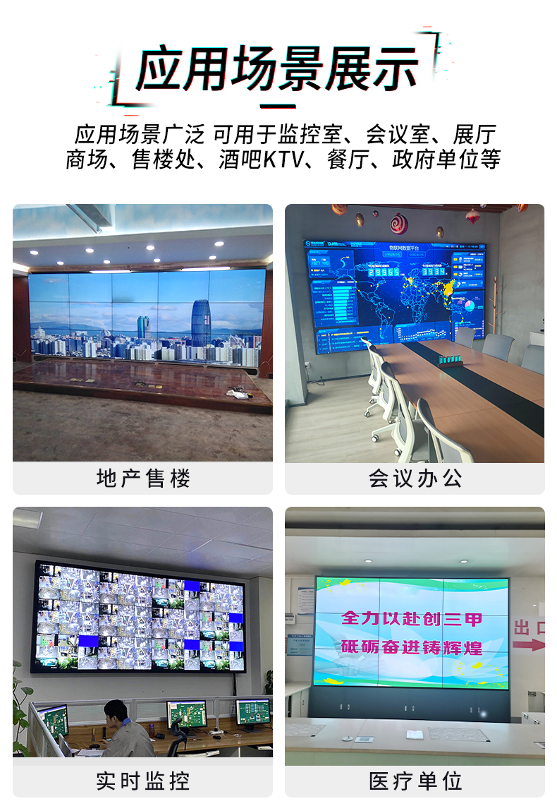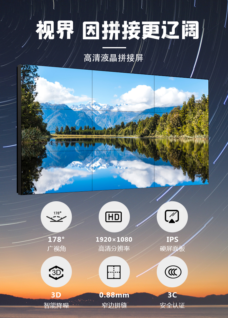 1:專業工業級DID液晶LED拼接顯示屏,500流明高亮度,5000:1的對比度;10000K的色溫; 2:專為視頻展示設計,高亮度高清晰度,完美顯示畫面的每一個細節 3:配合圖形處理器和矩陣,最大可支持到256個液晶拼接單元 4:超窄小拼縫雙邊0.88mm 5:高分辨率,單屏可達1920×1080 6:超長壽命,運行穩定,沒有任何灼傷、損傷,維護成本低 7:豐富的輸入輸出接口,VGA、HDMI、DVI、BNC視頻接口端子,可接電腦和各種視頻設備 8:全新的“超寬視角延展技術”(LED背光),保證在上下左右178度視角內觀看到的圖像不變形,色彩無失真 9:帶字幕功能,可在拼接屏上任意輸入字幕 10:可以做LOGO拼接產品咨詢
